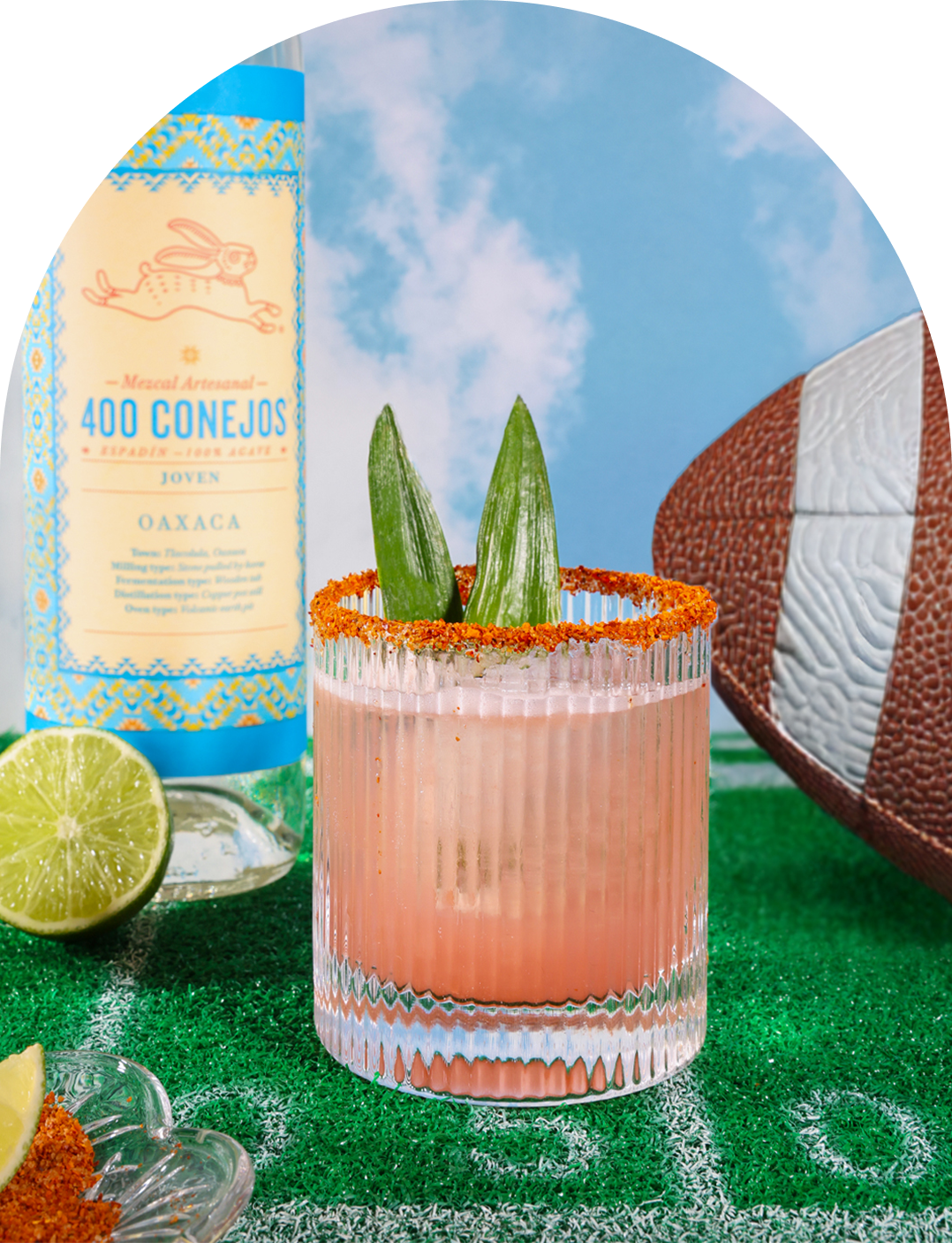 In a cocktail tin, combine 400 Conejos Joven Mezcal, Fresh Lime Juice, Pineapple Juice and Reál Guava Syrup. Add ice to tin and shake. Strain into a rocks glass rimmed with Tajin, over fresh ice. Garnish with 2 Pineapple Leaves placed to resemble "Bunny Ears"